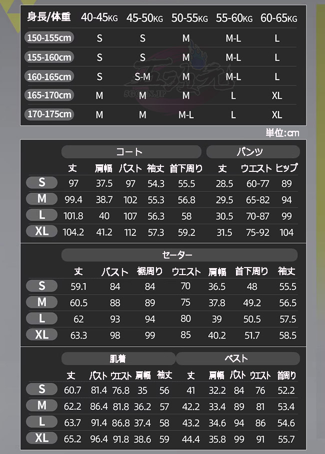 ①衣装は規定サイズ・規定数量でまとめて生産されていますので、サイズオーダー及びセット内容の一部を別サイズに変更する事は不可です。