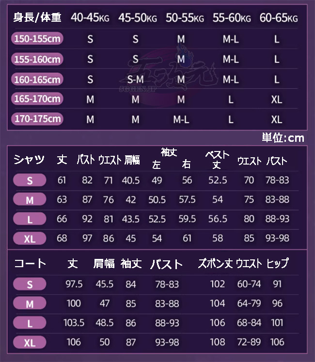 ①衣装は規定サイズ・規定数量でまとめて生産されていますので、サイズオーダー及びセット内容の一部を別サイズに変更する事は不可です。