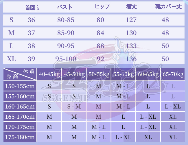 ①衣装は規定サイズ・規定数量でまとめて生産されていますので、サイズオーダー及びセット内容の一部を別サイズに変更する事は不可です。