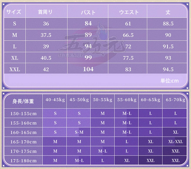 ①衣装は規定サイズ・規定数量でまとめて生産されていますので、サイズオーダー及びセット内容の一部を別サイズに変更する事は不可です。