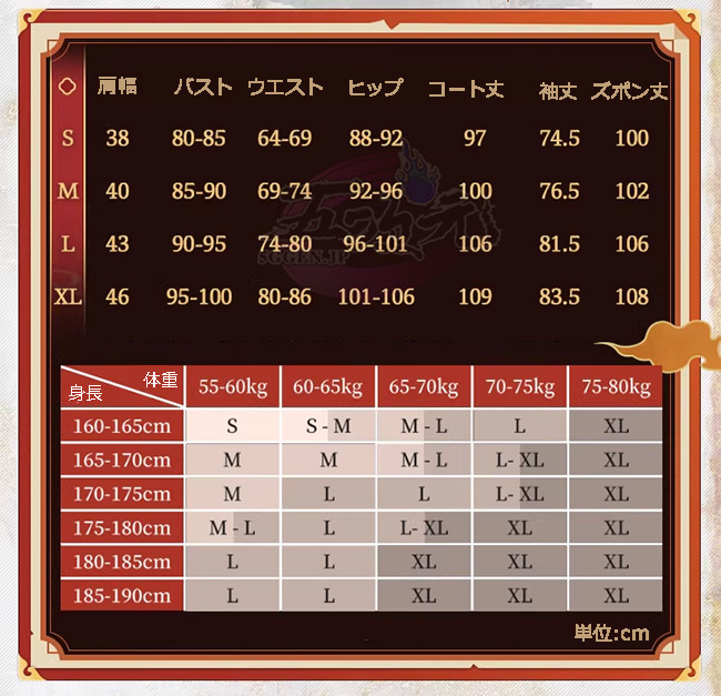 ①衣装は規定サイズ・規定数量でまとめて生産されていますので、サイズオーダー及びセット内容の一部を別サイズに変更する事は不可です。