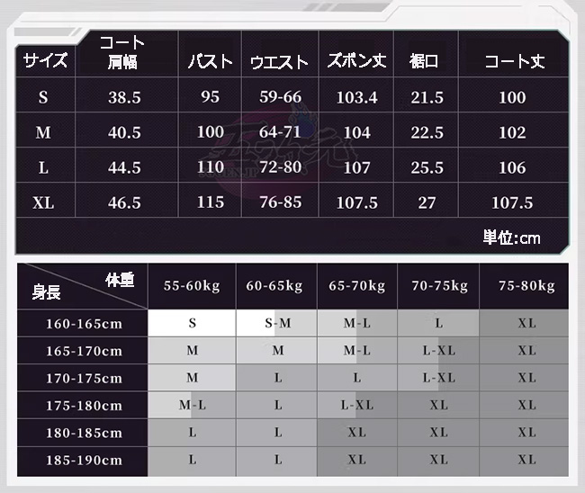 ①衣装は規定サイズ・規定数量でまとめて生産されていますので、サイズオーダー及びセット内容の一部を別サイズに変更する事は不可です。